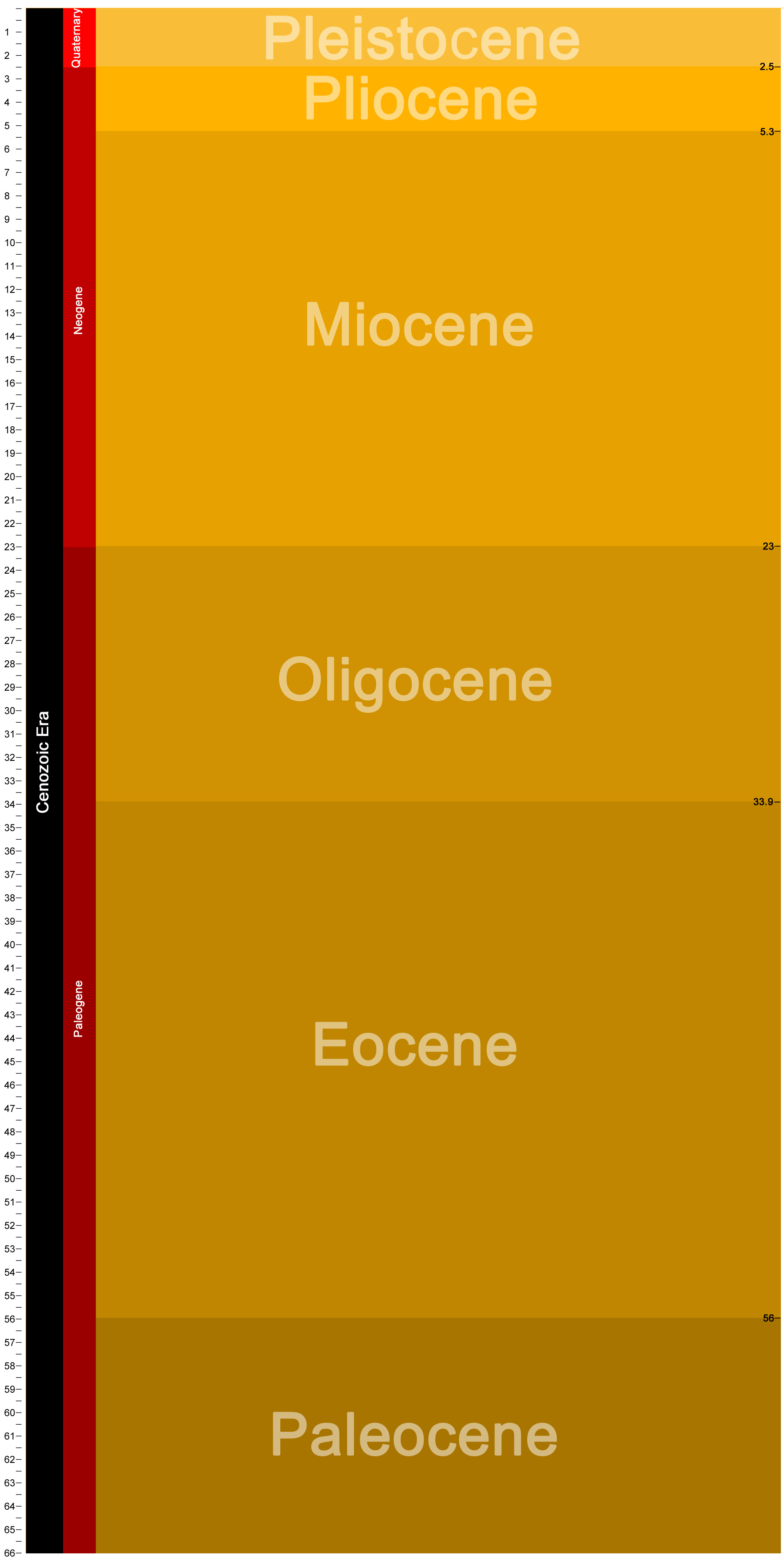 The Cenozoic era is divided into three periods: Paleogene, Neogene, and Quaternary. Each of these is, in turn, subdivided into seven smaller units known as epochs: Paleocene, Eocene, Oligocene, Miocene, Pliocene, Pleistocene, and Holocene.
