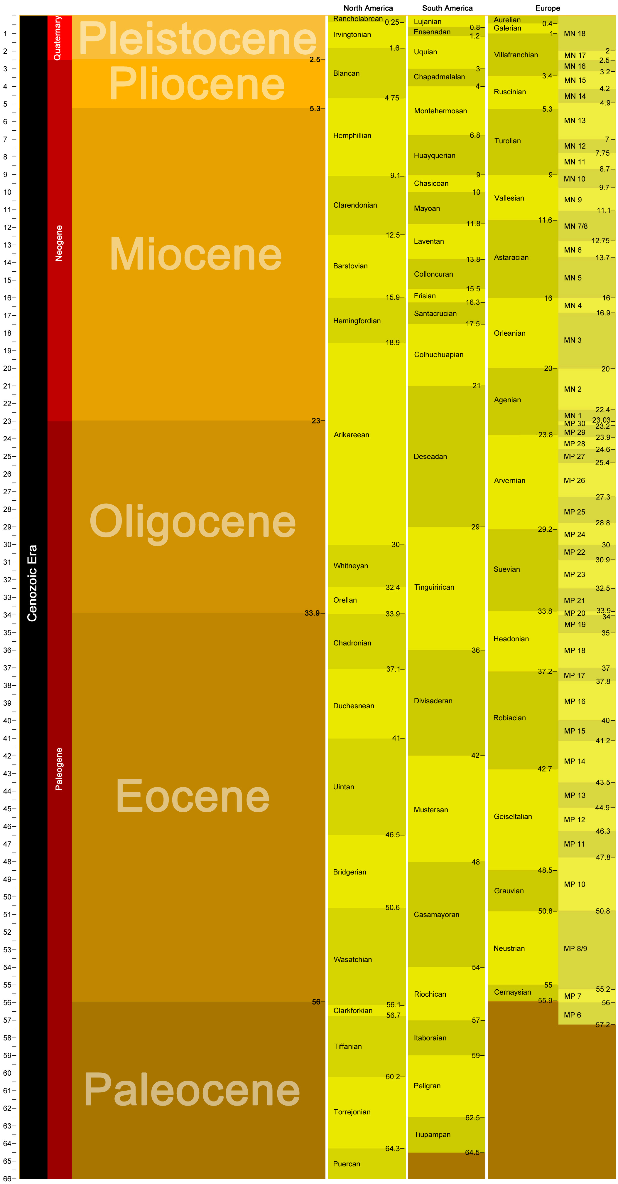 The epochs are broad spaces of time; up to 18 million years in the Miocene and as little as 13,000 years for the Holocene. For this reason, when discussing organisms or events within these epochs it is often useful to subdivide these into “early”, “middle”, and “late” intervals to be specific. To be even more precise, however, paleontologists often use another set of terms to refer to geologic time within epochs: Land Mammal Ages (LMAs). LMAs are intervals of geologic time within epochs that are characterized by a distinctive set of mammals for a particular geographic region, usually entire continents. Likewise, there are different sets of LMAs for North America, South America, Australia, Asia, and Africa. A functionally similar system is used in Europe but with a different style of terminology and names. The mammalian fossil record is useful in estimating time because mammals are abundantly preserved in most places, many lineages have a relatively rapid evolutionary rate, and their teeth are anatomically complex enough to allow the recognition of distinct species